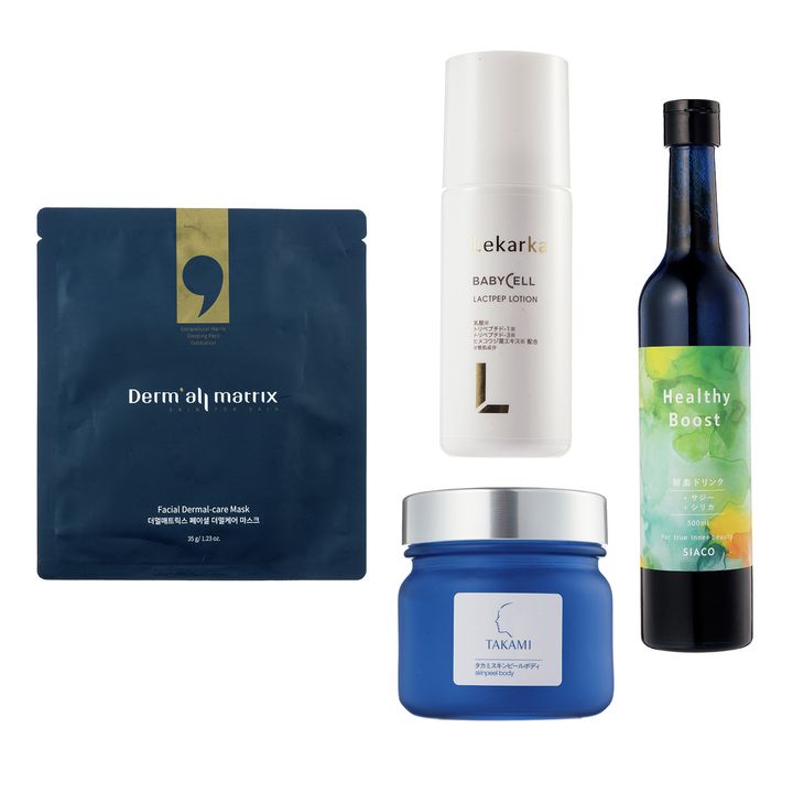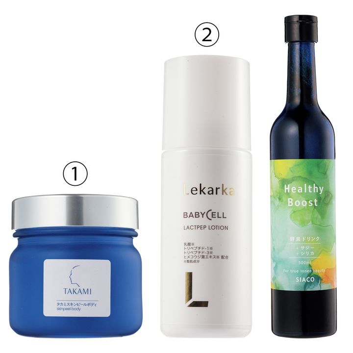 (左から)首から下はタカミの角質ゲルでつるつるに。レカルカのラクトぺプローションで、保湿とキメを整え肌の土台作り。SIACOの酵素ドリンクでファスティング。