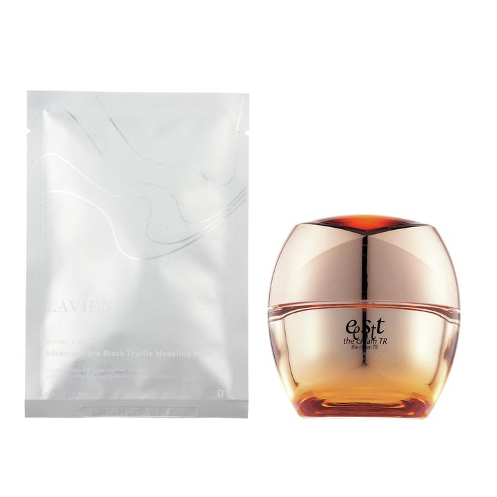 ここで、角質除去を。黒トリュフとキャビアから抽出されたエキスが配合されたLAVIENのパックを。エストのクリームで、圧倒的な保湿力とハリ感をしっかりキープ。