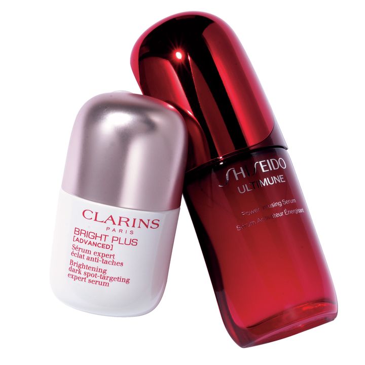(左から)独自のブライトサイエンスで透明美肌に。ブライトプラス ブライトニング DST セラム[医薬部外品] 30ml ¥13,530(クラランス)、老化細胞にアプローチ。輝くような明るい肌へ導く。アルティミューン パワライジング セラム 50ml ¥15,180(SHISEIDO)