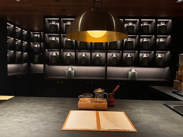 ヌードルバーの奥にあるのが、静かにお茶を楽しめるティーハウス。ここもぜひ立ち寄りたいエリア。照明を落とした落ち着いた空間で、専任のスタッフが淹れてくれる高品質な中国茶を味わうことができます。使われているのは2004年にイギリスで創設された英国高級紅茶ブランド・JINGです。常時8種類ほど扱われており、茶器に注がれた温かなお茶の香りが、心と体をじんわりとほぐしてくれるのを感じました。スマートフォンを手放し、旅のスタートを五感で味わう贅沢な時間が、ここにはあります。