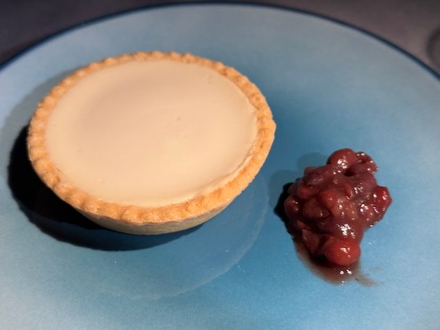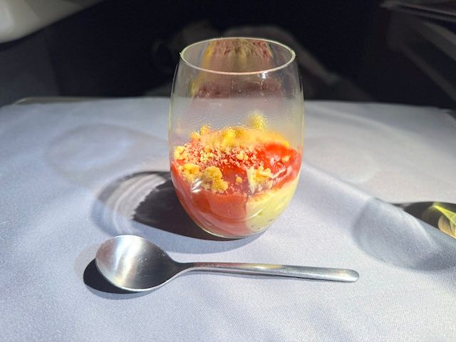 さらに感動するのは、デザートの豊富さ。フレッシュフルーツやイチゴとルバーブを使ったタルトはミニパフェのようになっています。豆腐タルトも気になったのですが、豆乳のような甘みを感じる固めのムースタルト。おいしくて機内食を食べすぎた胃には優しい甘さで癒やされました。