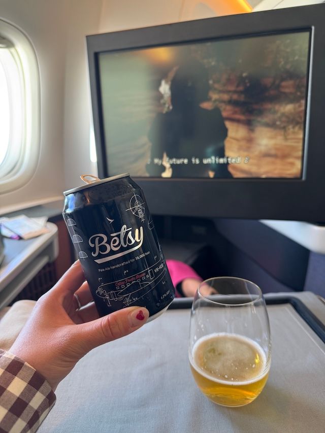 ドリンクの種類も豊富で、シャンパン、白ワイン、赤ワインをはじめ、カクテルの提供も! マストで飲んでおきたいのがキャセイパシフィックオリジナルのクラフトビール! なんとキャセイでビールを作っているのです。ペールエールタイプのビールです。こちらはラウンジでも缶ビールとして飲めますが、せっかくなら高度35,000フィートの空の上で楽しんでみては?