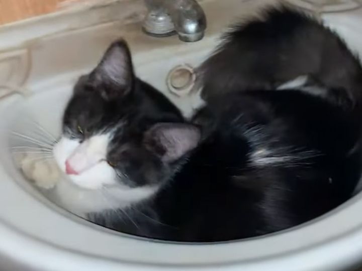 3. ここが一番涼しいにゃ! 洗面台の中でぐっすり眠る猫さん