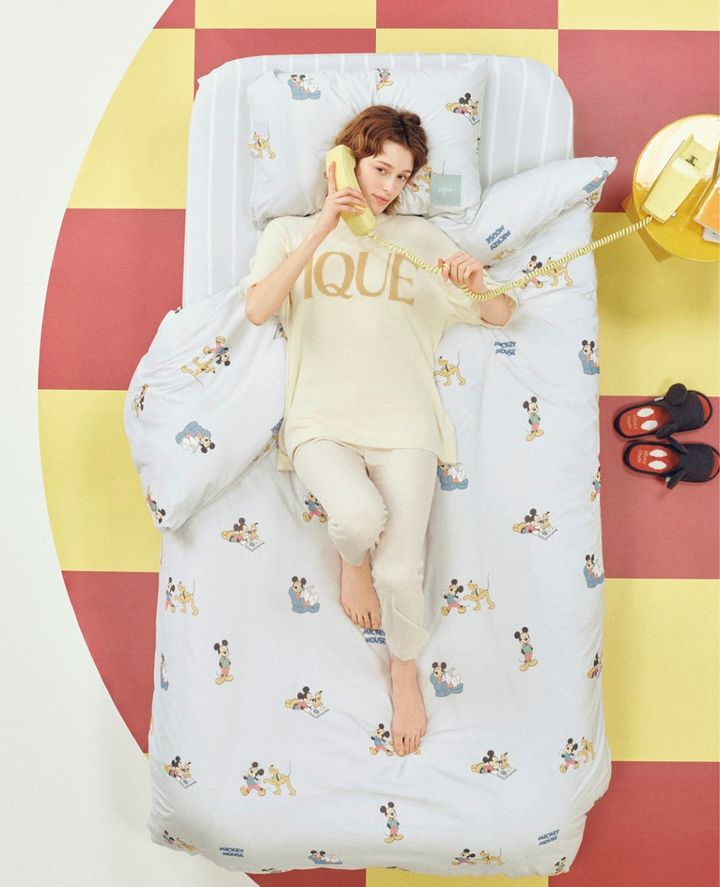©︎Disney Mickey プリントピローケース&掛け布団カバーセット[シングル用]¥14,960、ルームシューズ ¥5,280