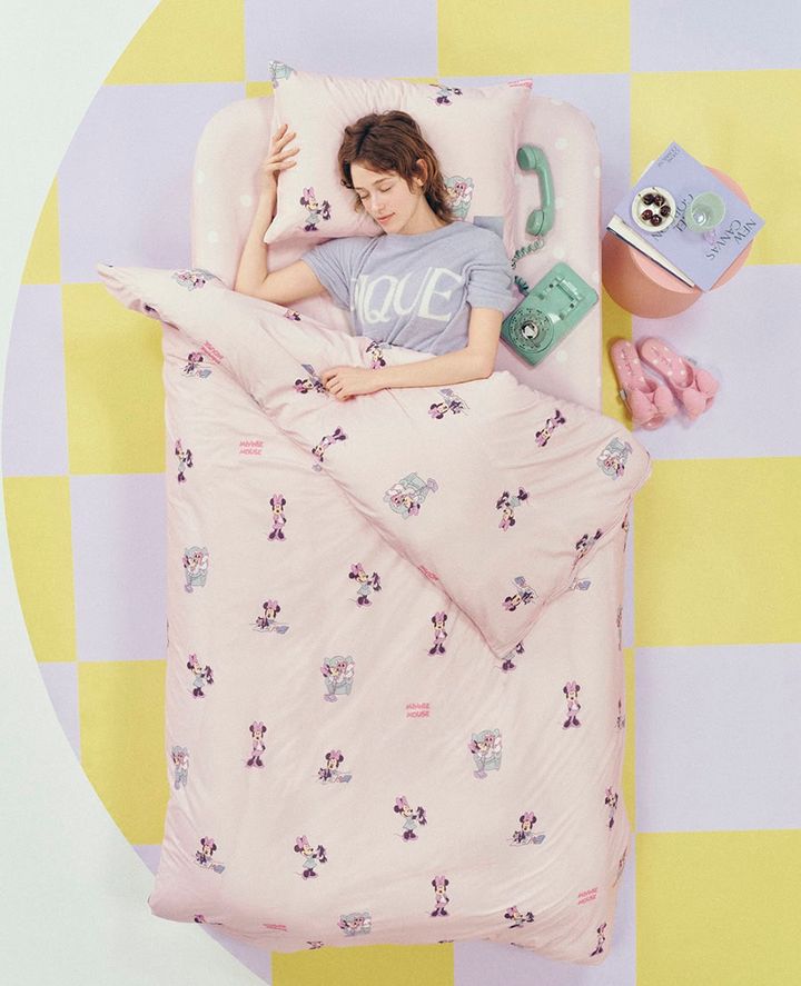 ©︎Disney Minnie プリントピローケース&掛け布団カバーセット[シングル用]¥14,960、ルームシューズ ¥5,280
