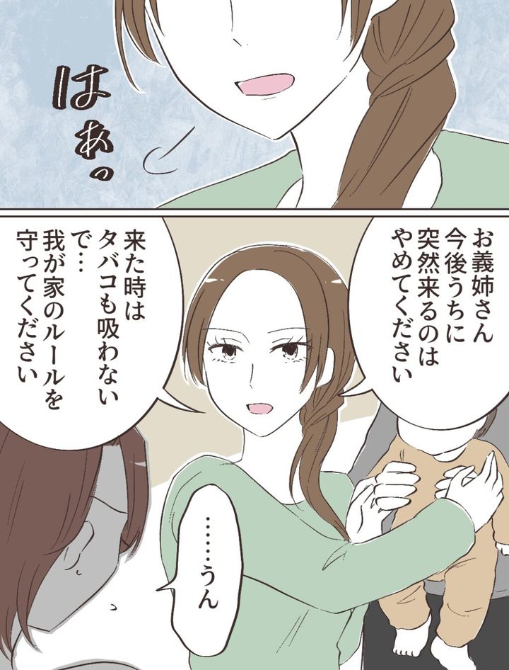 私はチエさんに「お義姉さん、今後うちに突然来るのはやめてください。来た時はタバコも吸わないで・・・我が家のルールを守ってください。」と守ってほしいことを伝えました。私の話を聞いてチエさんは素直に「・・・うん」と返事をしてくれました。