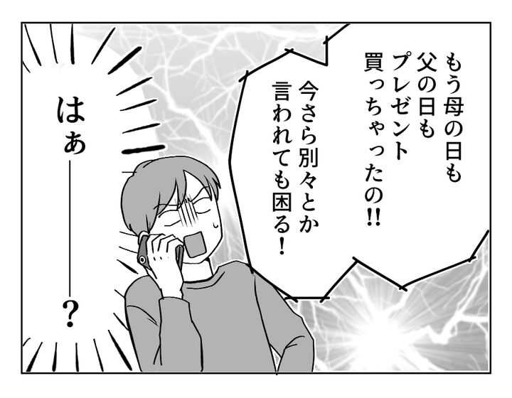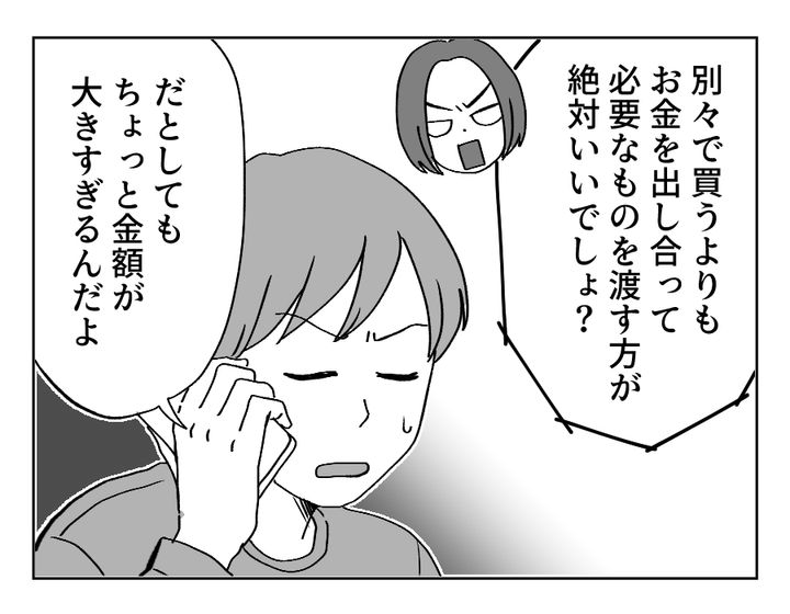 アレ――? すでに贈りものを買ってしまったというユウコさん。え――っと、ユウコさんは今まで両親への贈りものを買う前に、折半で払ってくれるアキラさんたちに相談をしていなかったのでしょうか。となると、アキラさんは毎回何を買ったかも知らされずに、ただ言われた通りのお金を払っていただけってこと……? いや~……それはさすがにシオリさんも、いい気はしないと思いますよ? ユウコさん。