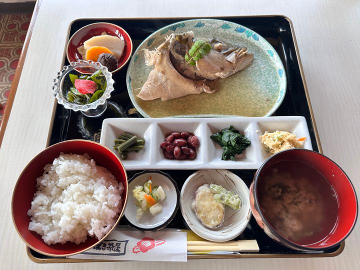 こちらが、「でまかせ定食」!気分で出てくる定食に、大きな兜煮が入っているではありませんか!😮本当にカマが大きい!ボリューム満点で、とても美味しいかったです!ちょうどいい味付けで食べやすく、必ず行くと再度決意しました!実は、海の景色を見ながら食事を楽しんでおりました💦(写真を撮っておりませんでしたが、絶景です!)ぜひ、皆様も行ってみてはいかがでしょうか😊