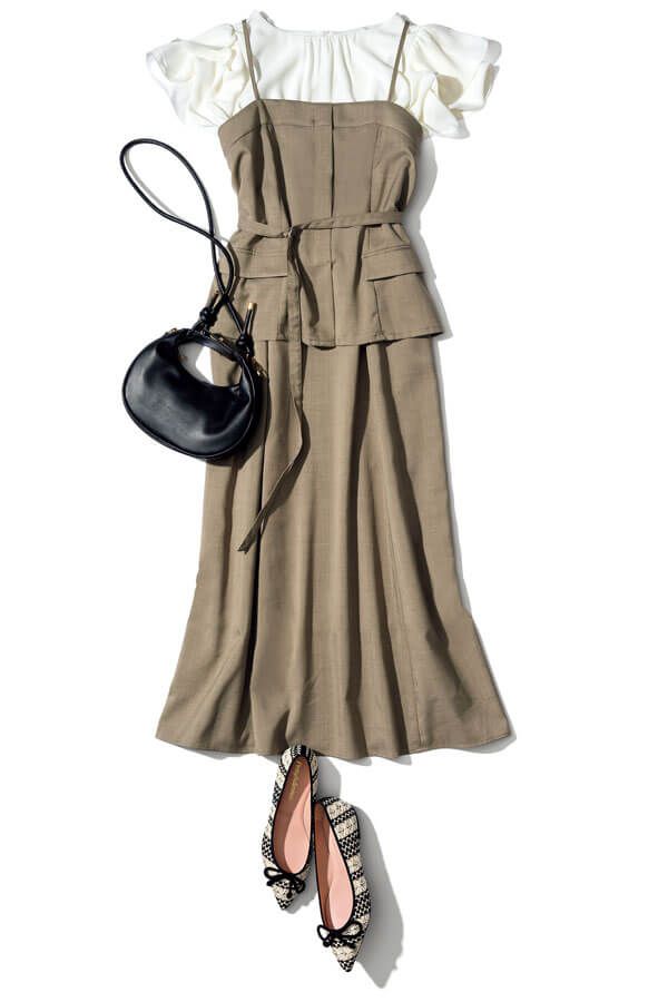 3. インに仕込むトップスで印象を変わるから着回し力抜群!「トレンチ風ジャンスカ」