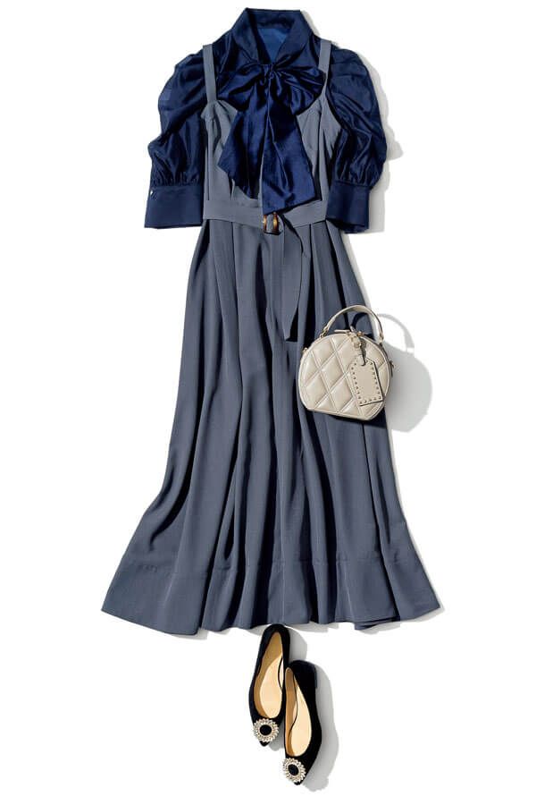 ジャンパースカート¥11,000/ミスティウーマン(アダストリア) ブラウス¥8,492/PROPORTION BODY DRESSING バッグ¥2,790/神戸レタス パンプス¥33,000/プリティ・バレリーナ(F.E.N.)