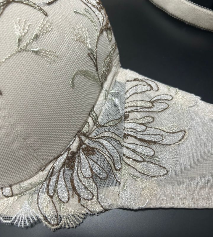 私が即買いを決意したのはこちら。フロラーレというシリーズの017で、庭のすみに咲く繊細なアジサイをストレッチリバーレースで表現したシリーズです。趣味のいいレースがあしらわれているのですが比較的シンプルなので日常づかいにいいですね。