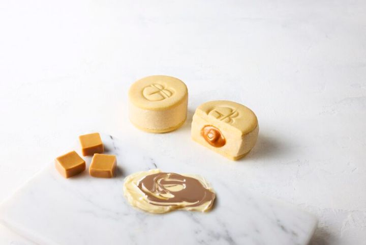 「ゴディバターズ バターサンド」(写真はショコラ キャラメル)は、サクッとした歯触りのサブレに、ベルギー産発酵バターとアンバーチョコレートを混ぜ合わせた淡黄蘗色のバタークリームをサンドしました。なめらかなバタークリームは優しい甘さで口当たりは軽やか。まさに「大人の贅沢おやつ」といった印象です。食べ進めると中央にはほんのり甘くてちょっとほろ苦い生キャラメルのフィリングがあらわれ、バターの豊かなコクを引き立てます。バターサンドは「ショコラ キャラメル」のほか、「ショコラ」「ショコラ フレーズ」があり、いずれもショコラバターの魅力がぎゅっと凝縮された、シェフイチ押しのスペシャリテです。