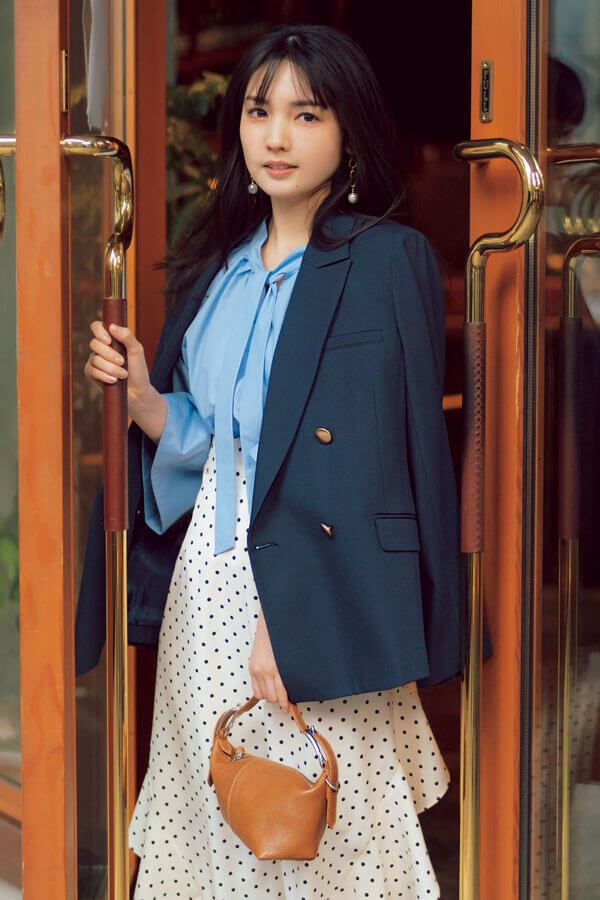 ボウタイブラウス¥8,492/NATURAL BEAUTY BASIC ジャケット¥22,000/Noëla ドット柄スカート¥11,000/31 Sons de mode(ヒロタ) バッグ¥121,000/J&M デヴィッドソン(J&M デヴィッドソン カスタマーセンター) ピアス¥36,520/ベン・アムン(ズットホリック)