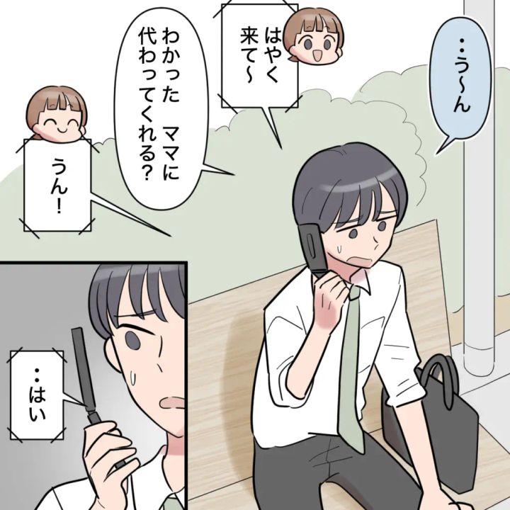 「ママ~、パパにおでんわして~」とサッちゃんにケータイを渡されたナエさんは、「え・・パパに?」と戸惑いますが、「うん。サッちゃんに会いに来てっていうの~」と言う無邪気なサッちゃんを見て断ることも出来ず「・・わかった」と言ってショウタさんに電話をかけサッちゃんに渡しました。