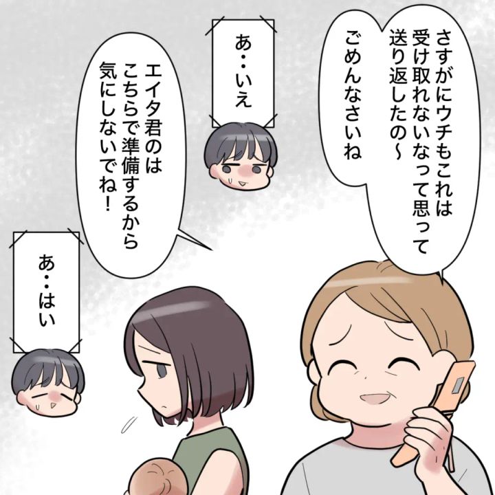 お母さんが「さすがにウチもこれは受け取れないなって思って送り返したの~。ごめんなさいね」と申し訳なさそうに言うと、「あ・・いえ」と気まずそうに答えるショウタさん。「エイタ君のはこちらで準備するから気にしないでね!」とお母さんに言われ「あ・・はい」と答えるしかないショウタさんです。