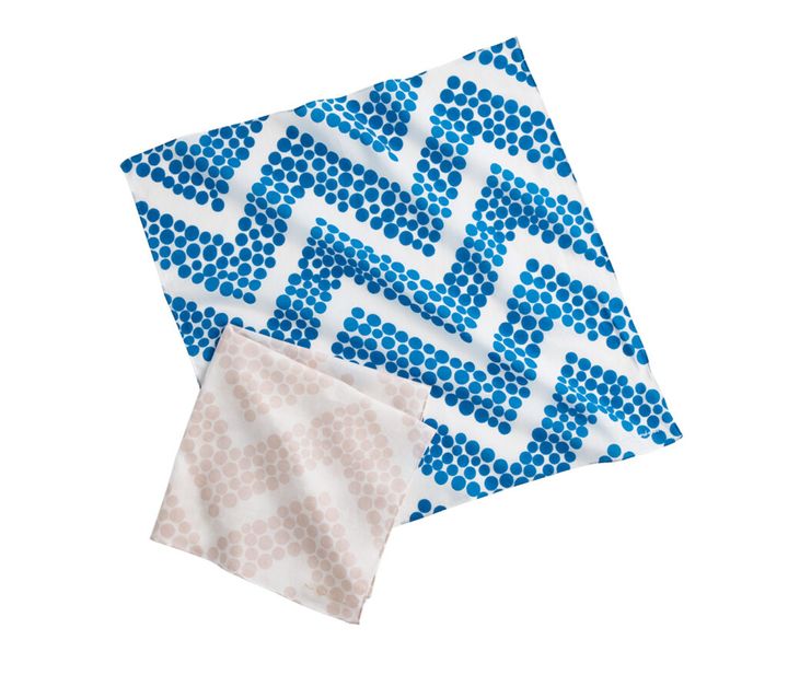 水玉がヘリンボーン柄に配置された〈ミナ ペルホネン〉のマルチクロス。ひと粒ずつ形の異なるドットは、“kupla”(泡)というテキスタイル名の通り、ふわふわと漂う泡のようにおおらか。軽く柔らかな質感のコットン地で肌あたりも良く、スカーフにしても気持ちいい。ハンカチとしてはもちろん、お弁当を包んだり、バッグに結びポイントにするなど、活用度大。