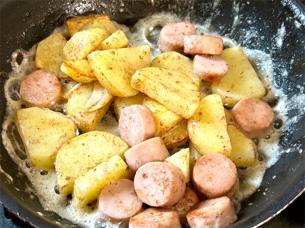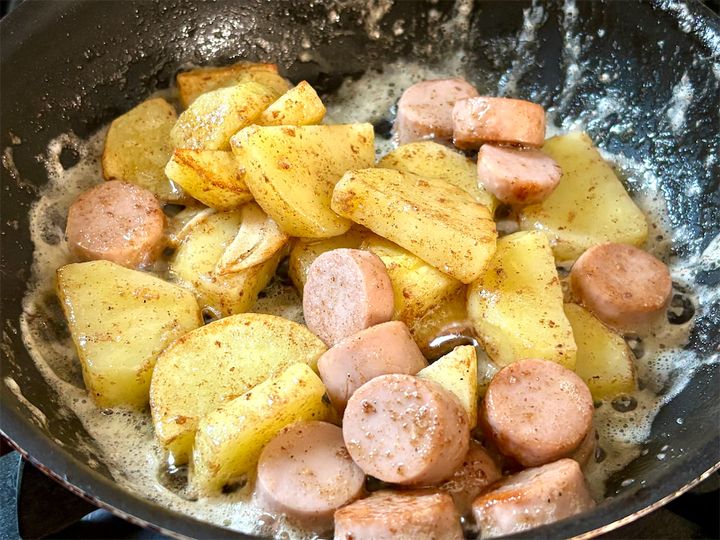 じゃがいもはホクホクしていて表面は香ばしく、魚肉ソーセージはやわらかく旨味はありますが、あっさりしています。ベーコンや肉系のウインナーソーセージでもいいかもしれませんが、コクのあるマヨネーズにさっぱりめの魚肉ソーセージは合うのかもしれませんね。