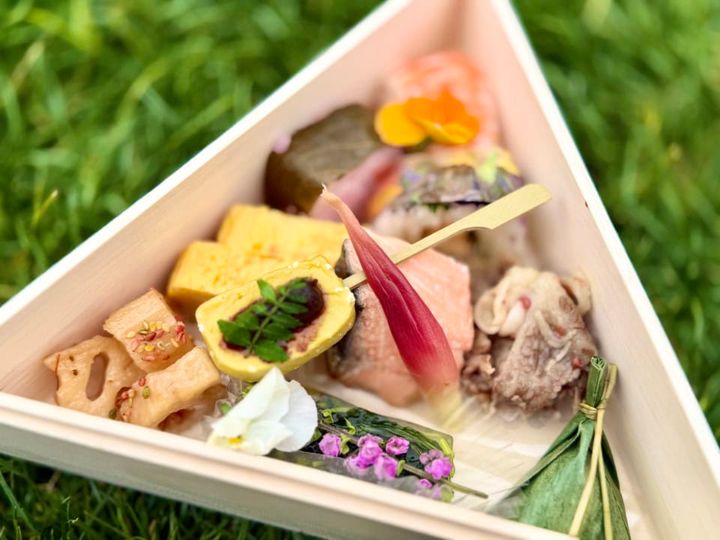 鮭の西京焼き、近江牛のすき焼き、手毬寿司など海外ゲストも喜びそうなメニュー。ヴィーガンメニューもありました。お弁当箱は結構ちゃんとした木製。