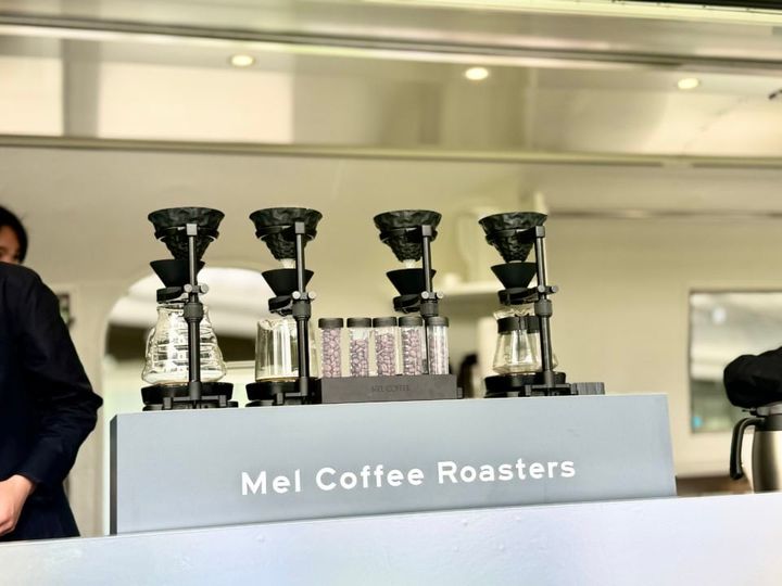 カフェコーナー、コーヒーは大阪の人気店「Mel Coffee Roasters」。カフェラテあったの嬉しい。深煎りで香り高い。もちろん途中で品切れ。