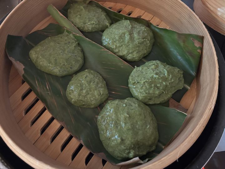 6.蒸し器に、さねんの葉を敷いて、その上に5の団子をのせる (今回は、いろいろなサイズで作ってみました)