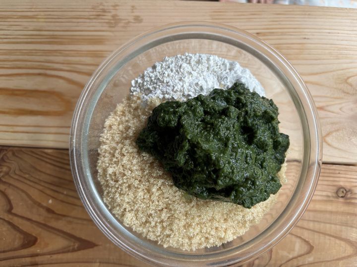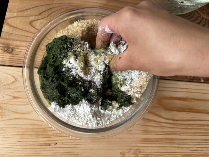 4.ボウルに、もち粉・砂糖・3のよもぎ・塩を入れてよくこねる