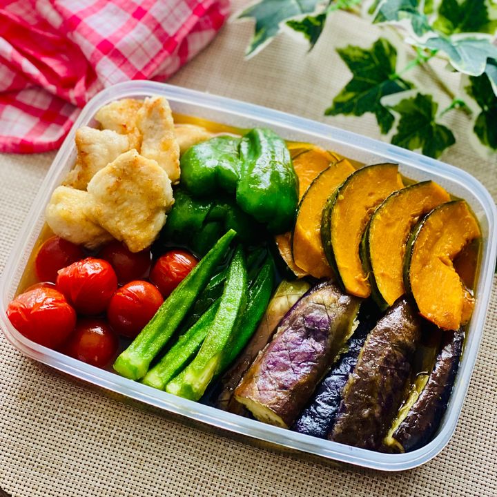 (9) タッパーに★を入れ、焼いた野菜とお肉を入れて、味を馴染ませたら完成!