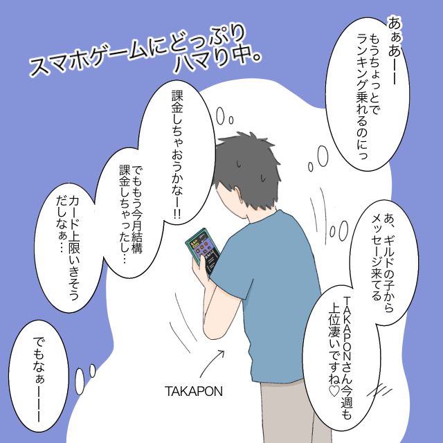 「あぁあー!もうちょっとでランキングのれるのにっ。あ、ギルドの子からメッセージ来てる。『TAKAPONさん今週も上位凄いですね!』・・・課金しちゃおうかなー!!でももう今月結構課金しちゃったし・・・カード上限いきそうだしなぁ・・・でもなぁーーーーー」と完全にゲームの沼に落ちてしまった夫。