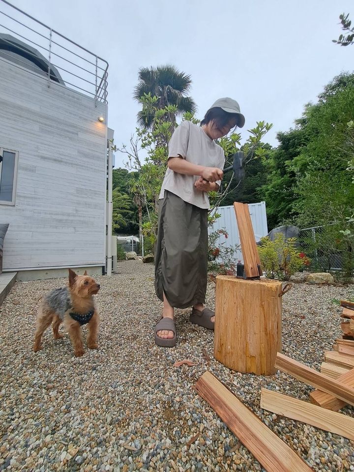 チェックインの後にまず楽しんだのは、今夜の焚き火に使う新割り体験!