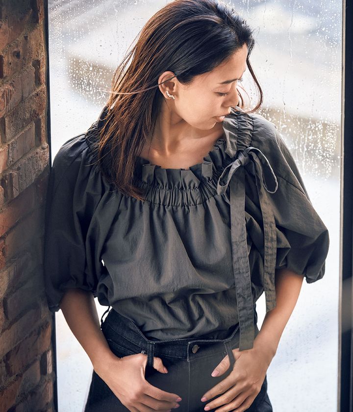 シャツ[撥水]¥49,500パンツ[撥水]¥52,800(ともにマッキントッシュ/マッキントッシュ 六本木ヒルズ店)キャミソール¥4,990(アンフィーロ/オンワード樫山)バッグ¥89,000(ポレーヌ)パンプス¥9,500(CHARLES & KEITH/CHARLES & KEITH JAPAN)イヤリング¥9,900(ステラハリウッド)バングル¥34,980(ソコ/ズットホリック)リング¥77,000(ブランイリス/ブランイリス トーキョー)傘¥14,300(トラディショナル ウェザーウェア/トラディショナル ウェザーウェア ルミネ有楽町店)