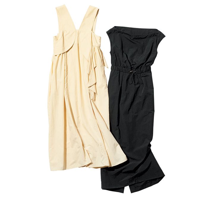 〈右〉品のいいバックウエスト開き。ワンピース[撥水]¥26,400(アンクレイヴ/オンワード樫山 お客様相談室) 〈左〉肌馴染みのいいイエロー。ワンピース[撥水・透湿・UVカット・接触冷感]¥30,800(ランバン オン ブルー)