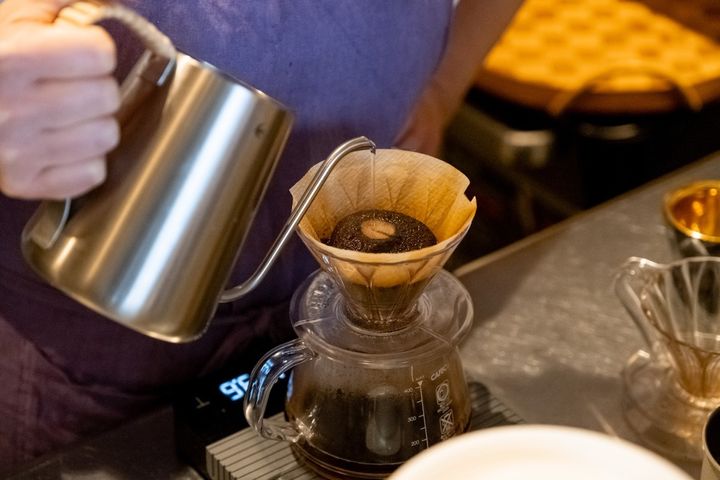 コーヒーは細く、細く、一定量でお湯を注ぎ続けてドリップします。ドリップポットは燕三条のプロダクトがお気に入り。