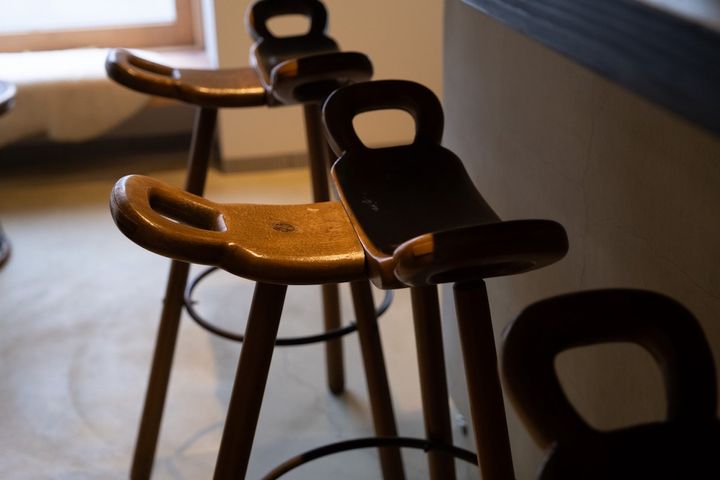 例えば、写真の椅子はスペインの建築様式の一種、スペイン・ブルタリズムを取り入れた1970年代のアンティーク。三方に取手のついたユニークな形状が印象的ですが、ハイスツールなのに長く座っていても疲れないところが気に入ってカウンター椅子として取り入れたそう。