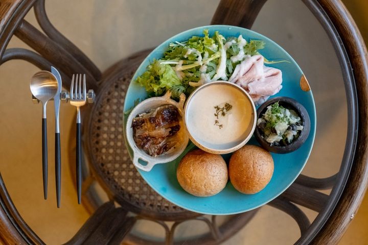 プレートの上には、花山椒のオイルで香り付けした菊芋のポタージュを主役に自家製ハムとリーフサラダ、さらには長ネギとゴルゴンゾーラとくるみのココットなど日替わりのデリ2種が並びます。野菜や鶏肉など素材が持つおいしさを引き立てながら、さりげないひと手間で素材の新しい顔も見せてくれる一皿です。食べていてしみじみとうれしくなる味わい。