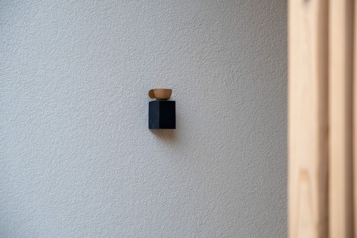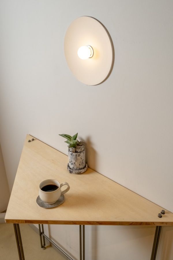 「ぽたぽた」の前は事務所だったらしく、カフェにするにあたり「せっかくリノベーションするのだから。」とライトは壁に埋め込んでスッキリと。満月のように店を照らすライトと三角テーブルの合わせ方にもセンスを感じます。