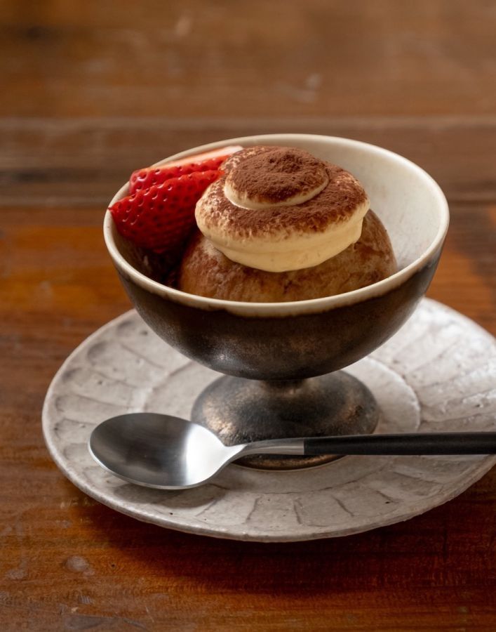 この日の“本日の菓子”は「ババ・オ・カフェ」。やわらかいブリオッシュ(パン)に特製のコーヒーシロップをしみこませ、バニラマスカルポーネクリームでデコレートしたティラミスのようなスイーツです。コーヒーのほろ苦さとバニラビーンズの入ったマスカルポーネクリームのなめらかな甘さが絶妙。