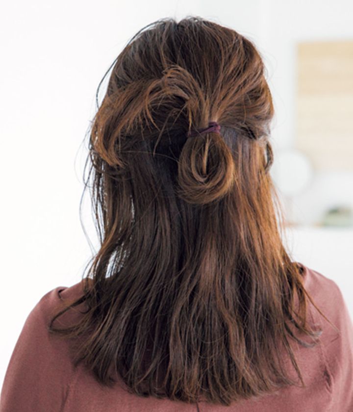 耳上2cmくらいの毛をざっくり取り、耳下の位置で輪っか結びをします。毛束をゴムに巻きつけ、毛先をゴムに引っ掛けたら完成。