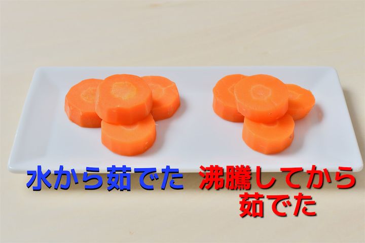 今回、試しに「水から加熱して茹でたにんじん」と「沸騰させたお湯で茹でたにんじん」を食べ比べてみました!
