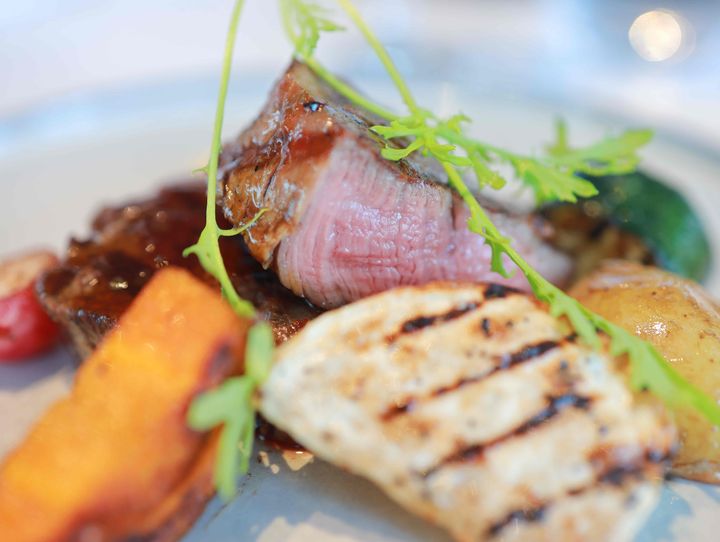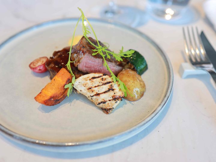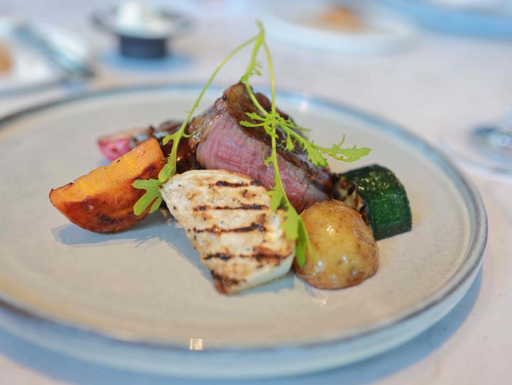 メインには、セットに2,000円を追加して「国産ホルスタインビーフフィレのチャーグリル アーストゥテーブルの有機野菜 うまみジュ × トリュフディジョン」をオーダー。香ばしくグリルされた彩り豊かな野菜に囲まれ、中央に堂々と盛り付けられた厚みのあるビーフフィレは、思わず心を奪われる存在感です。