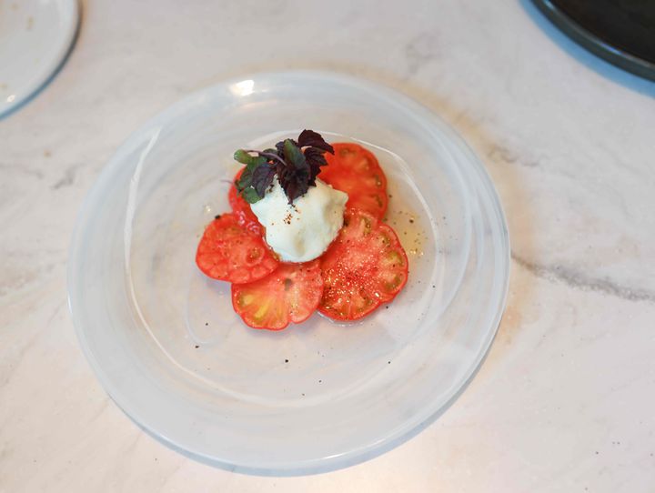 炙りゴートチーズを添えた高知県産のLisaフルーツトマトの前菜は、一皿でも注文可能。甘みと酸味のバランスが絶妙なトマトに、山羊特有の風味が魅力のゴートチーズが寄り添い、京都・與兵衛の鮓酢が全体をやさしくまとめあげます。素材それぞれの個性が引き立つ、印象的な一品です。