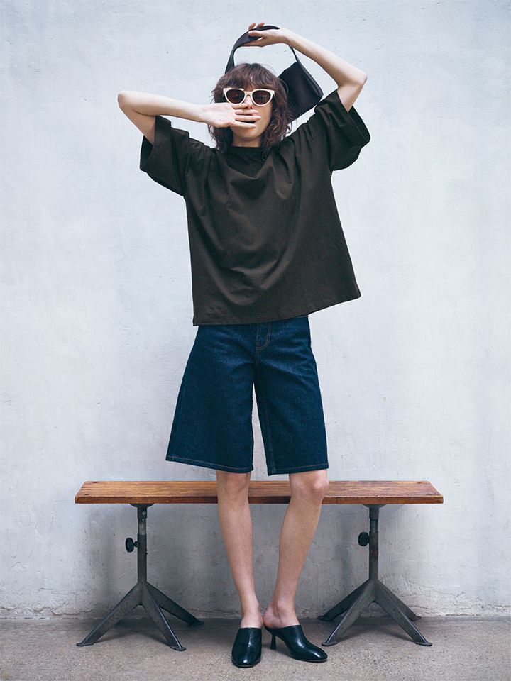 【POINT】ビッグサイズのブラウンTで重心を上げて、ハーフ丈のデニムをバランスよく。幅広なAラインで太ももまわりに余白が生まれるため、脚線を華奢見せできる。