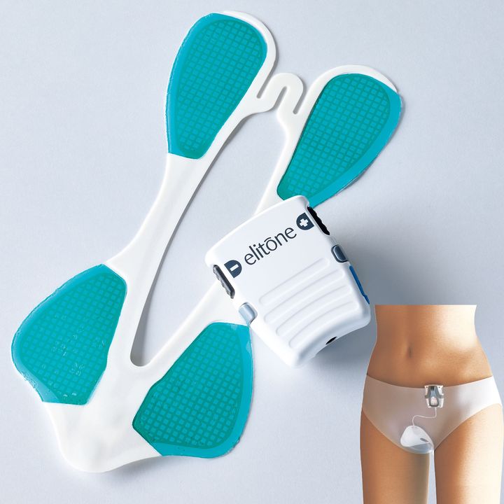 ゲルパッドを外陰部に貼り、リモコンのスイッチオンで1回20分骨盤底筋トレーニング。週に5回のペースで8週間継続を。エリトーン 本体+使い捨てゲルパッド10枚のセット ¥108,900(白金高輪海老根ウィメンズクリニック)