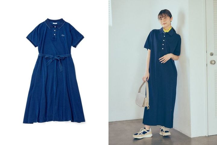 褪せたようなヴィンテージな風合いが魅力のインディゴ鹿の子ポロワンピ。ブラウジングも楽しめる共地のベルト付き。¥24,200/ラコステ(ラコステお客様センター)