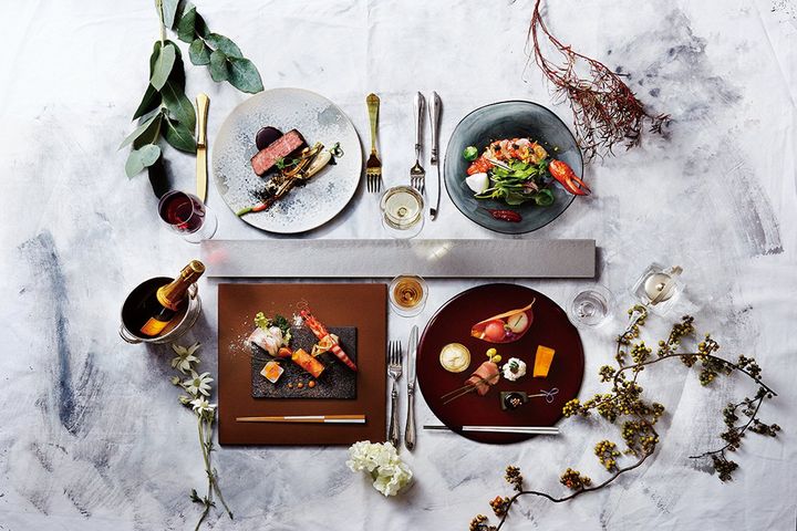 フレンチの技法に、だしや食材で和の心を融合させた、箸でも食べられる「ヌーヴェル キュイジーヌ ジャポネ」が名物。式のコンセプトに合わせ、オリジナルメニューを考案・提供。
