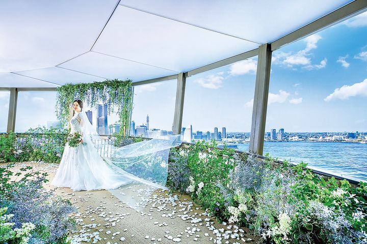 挙式は選べる2スタイル。地上100mに位置し、横浜の景色を360度見渡せる「展望フロアチャペル」では、青い海と空が織りなす文句なしの絶景が楽しめる。ゲストも大興奮。