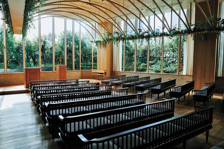 木材をふんだんに使用したチャペルは、窓の外も木々に囲まれ、思わず深呼吸したくなるようなリラックス空間。アーチ形の天井から自然光が降り注ぐ。最大着席人数は120名。