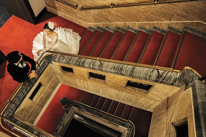 コンサートや映画撮影などに利用され、愛されてきた九段会館。歴史と文化が薫る非日常な空間だからこそ、記憶に残る結婚式が叶う。赤いじゅうたんと白いドレスとの相性は抜群。