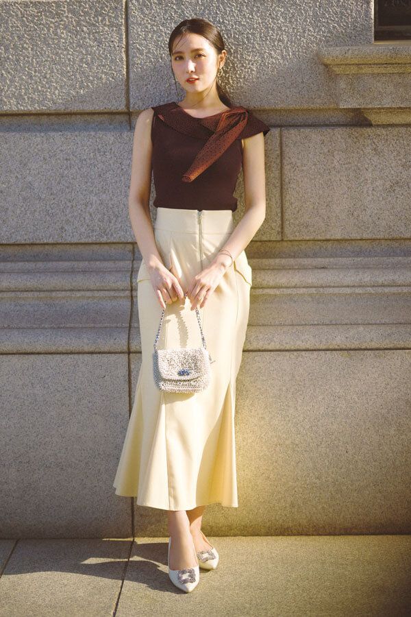 大きなリボン付きの甘口ニットをブラウンにスイッチさせるだけでリッチ感がアップ。マーメイドスカートでシックな印象を高めて。