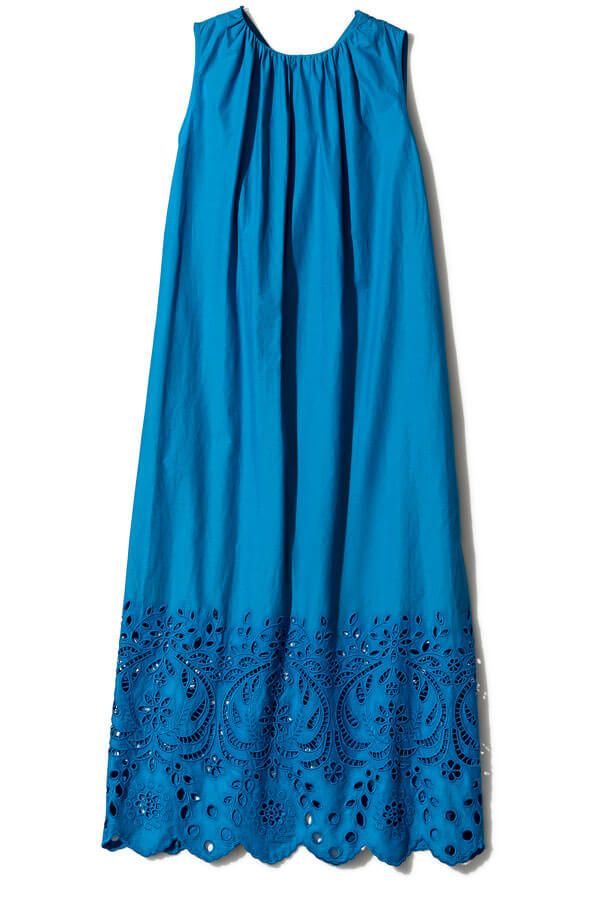 夏らしいリゾーティーな雰囲気も漂うふんわりシルエットのロング丈。裾に幅広くあしらわれたカットワークレースが、甘さと抜け感を兼ね備えた好ディテールです。