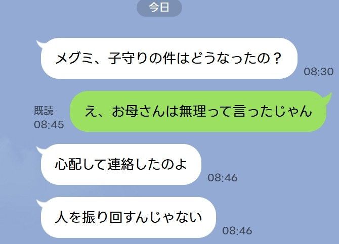 私は、そのLINEを見て、目を疑った。子守はできないと断ったはずなのに、なぜ今頃になって聞いてくるのだろう。