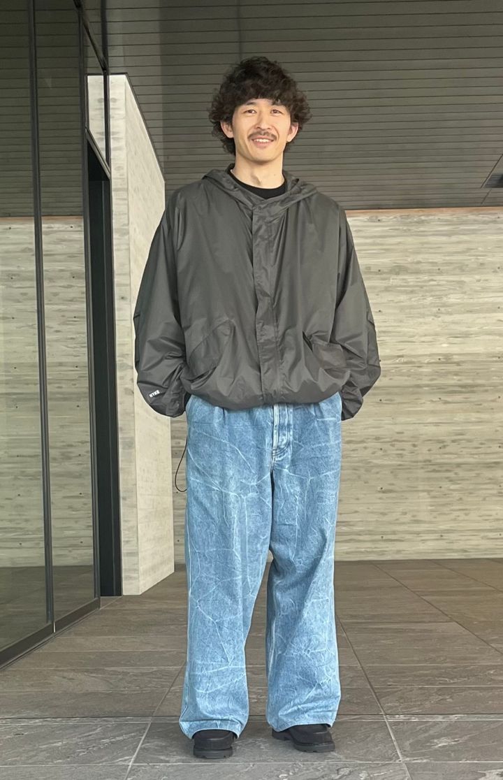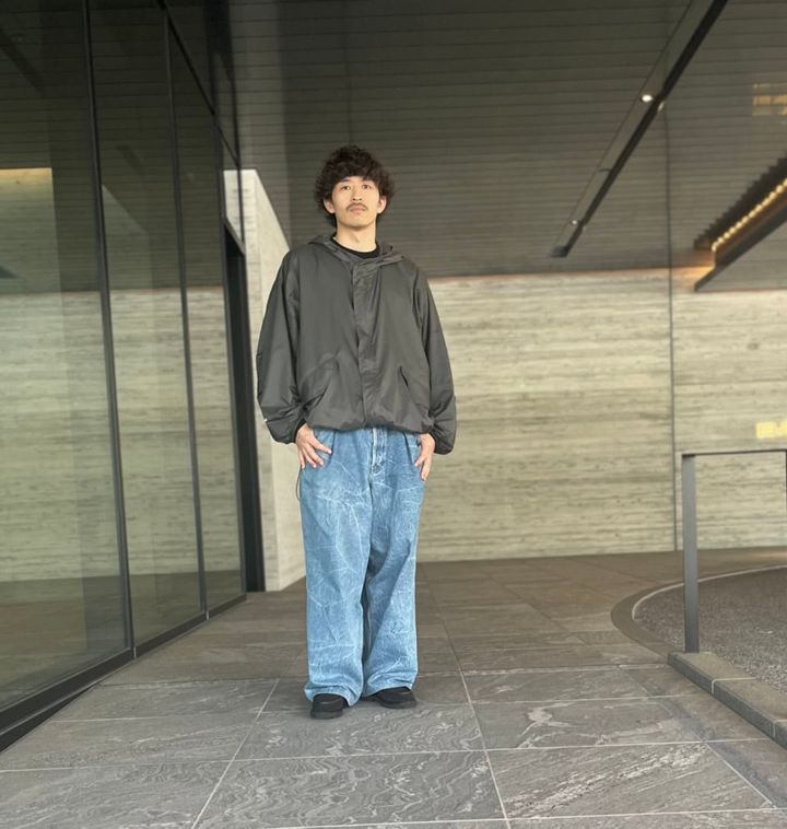 このジャケットは裾にドローコード付きで、シルエットを自在に変えられるのも見どころ。「デニムもジャケットも大きめだとバランスが悪いので、ウエストをキュッと絞ってコンパクトに仕上げているのもポイントですね。足元はワイドなデニムとも相性がいいボリュームあるローファーに。ソールもラバーなので梅雨でも気負わずはけるんです」